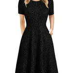 Ši retro stiliaus suknelė pasižymi klasikinėmis A-line siluetu, trumpomis rankovėmis ir apvaliu iškirpimu, suteikiančiu švarų, amžiną įvaizdį. Prigludęs liemuo pereina į švelniai išplatintą sijoną, kuris krenta žemiau kelių, siūlydamas tiek komfortą, tiek eleganciją. Šoninės kišenės prideda praktiško žavesio šiai drabužių spintos pagrindinei daliai.