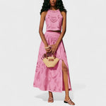 Su savo subtiliu nėriniuotu audiniu, plonu viršumi su petnešėlėmis ir aukšto liemens sijonu su skeltuku, Olympe yra šiuolaikiškas, lengvas ir moteriškas. Dėvėkite jį vasaros pasivaikščiojimui, saulės aperityvui ar ypatingam renginiui: būsite laisvos ir patogios. Komplektą galima dėvėti kartu arba atskirai, priklausomai nuo dienos stiliaus.